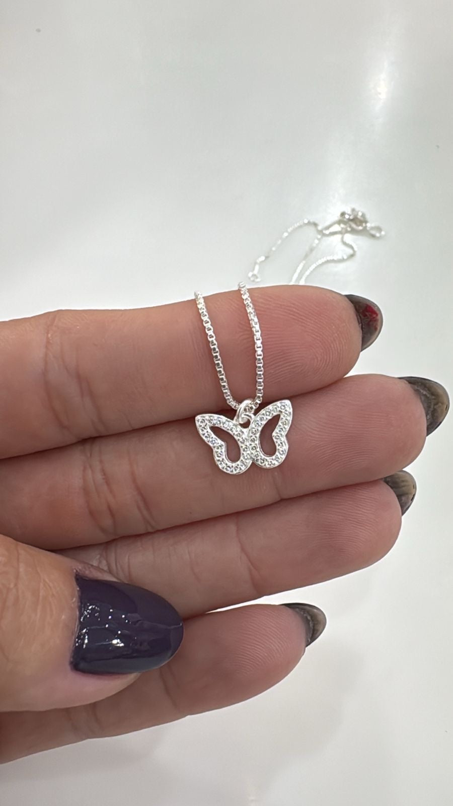 Encante-se com esta delicada gargantilha em PRATA 925, adornado com um pingente em formato de borboleta cravejado de pequenos detalhes brilhantes. Um acessório leve e elegante, perfeito para complementar qualquer look com um toque de charme e sofisticação.