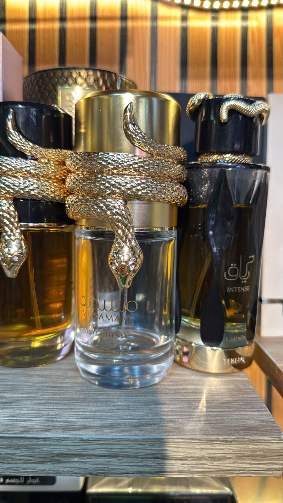 MUSAMAM INTENSE combina luxo e intensidade em um frasco envolvido por uma serpente dourada — símbolo de charme, mistério e poder.